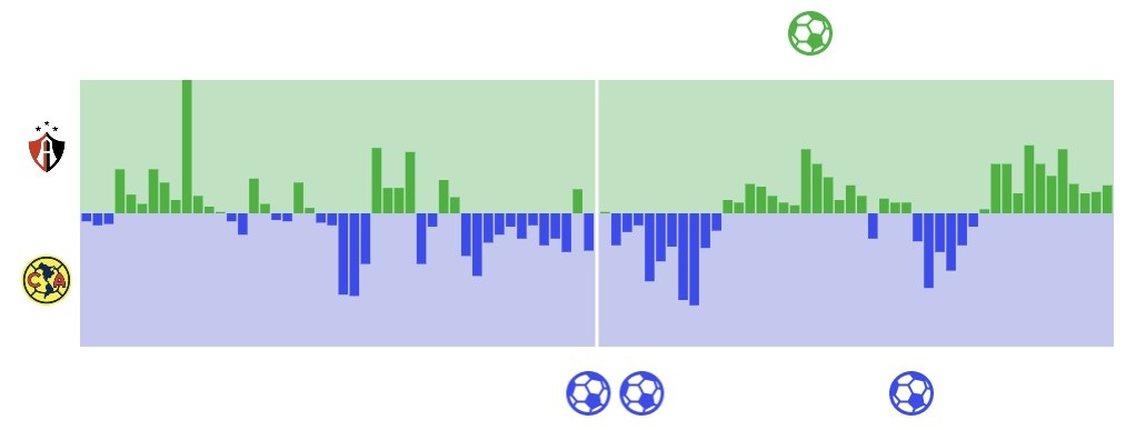 El primer tiempo fue americanista, aunque Atlas estuvo activo al frente. La segunda mitad nos muestra un periodo de dominio absoluto americanista, compartido por un Atlas insistente, pero que se topó con un gran Malagón.