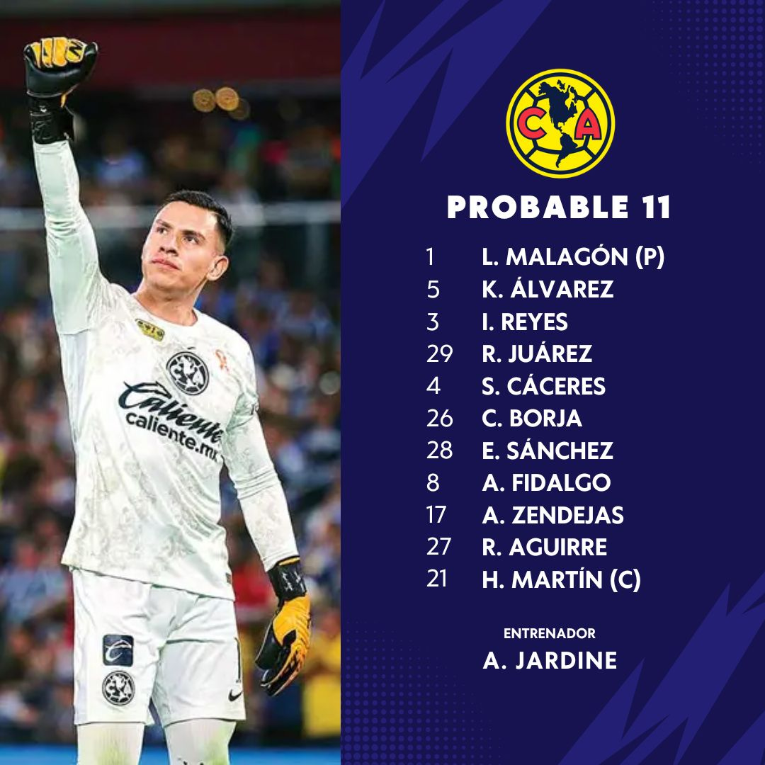 Con lo que veríamos en el marco a Luis Malagón, mientras que en las laterales estarían Kevin Álvarez y Cristian Borja. En la central volverían Ramón Juárez, Sebastián Cáceres e Israel Reyes.