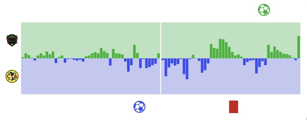 Juárez tuvo más la pelota en el primer tiempo, pero América fue el más peligroso en los últimos minutos de esa mitad, mientras que dominó el inicio de la segunda. Tristemente, cuando Juárez quiso, puso en peligro el marco de Cota. Con la expulsión, todo se fue a la basura.